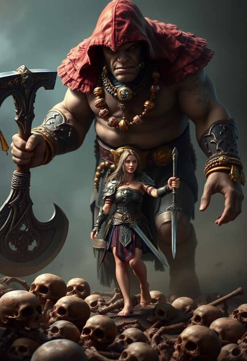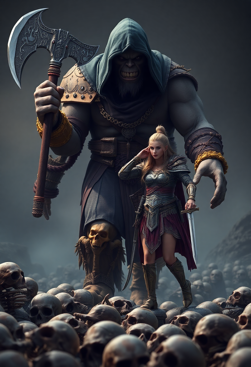 Ultra realistic looking DND character, ), hooded giant ogre, holding a giant cursed axe and walking menacing, walking over crushed skeletons, golden ornamented bracelets, jeweled belt, and necklaces. Facing him, stands a tiny barefoot female warrior with full armor, arms extended to the sides, holding a sword and a dagger, standing confidently, dramatic scene, cinematic