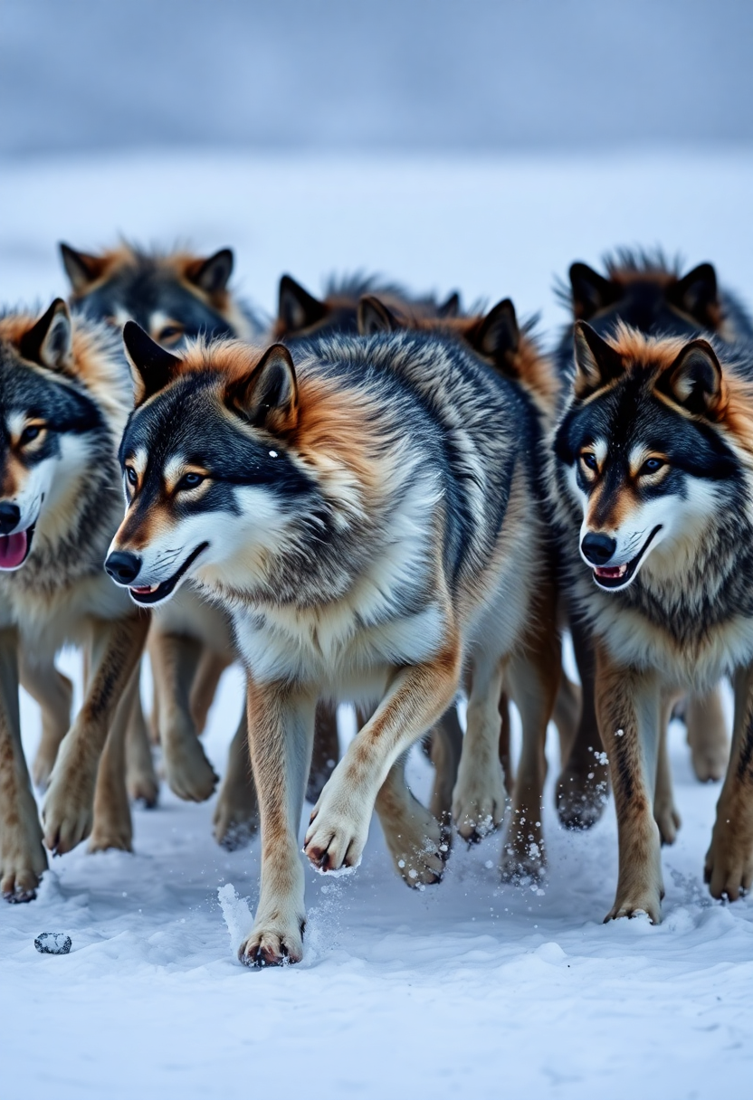 An intense 8K capture of a pack of wolves running together, their fur ruffled by the wind and snowflakes. The motion of their paws kicking up snow adds depth and energy to the scene.