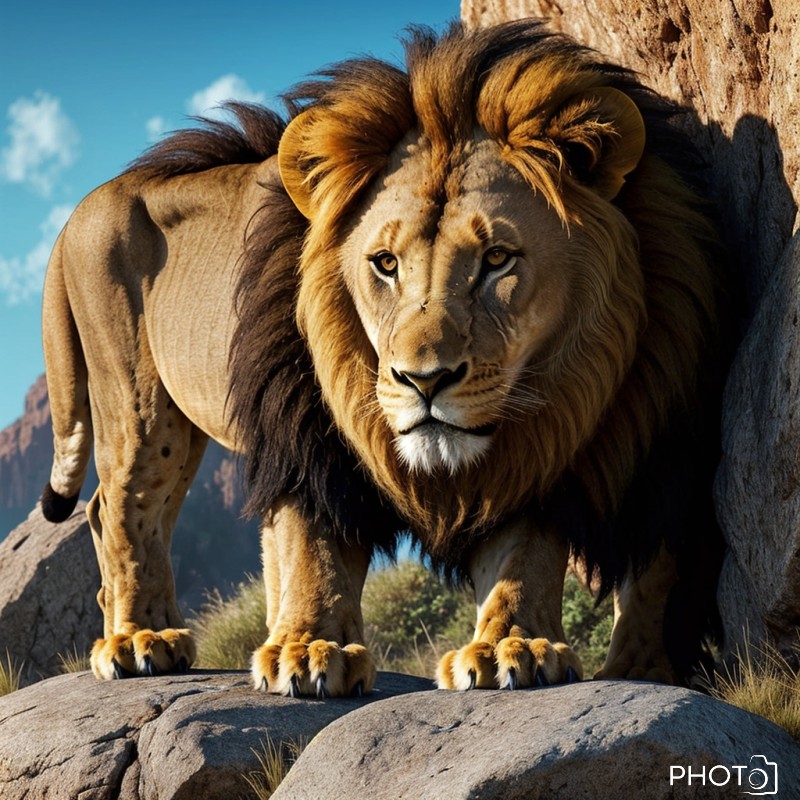 Capture the majesty of the wild with this cinematic snapshot of a lion, regally posed against a clear blue sky on rocky terrain. His vibrant orange mane and imposing presence make this image perfect for any wildlife enthusiast's collection or as a striking poster.
