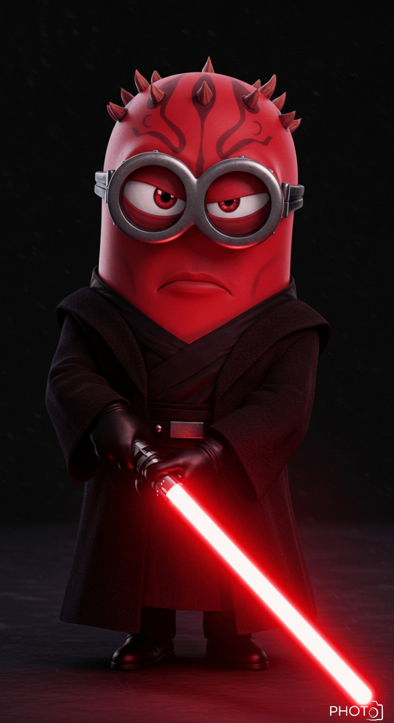 A fierce, red-skinned Minion transformed into a Dark Jedi, sporting Darth Maul-like spikes and a scowling, one-eyed glare. Draped in a shadowy Sith robe, he grips a flawless red lightsaber, its glow cutting through a pitch-black void as he points it menacingly at you. A stunning 4K masterpiece of concept art!