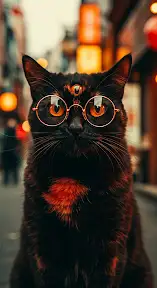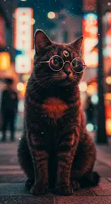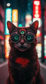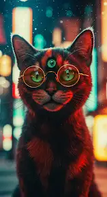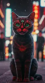 A striking black and red cat perched on a bustling Tokyo street, sporting round-framed third-eye sunglasses that gleam with enigma. Bathed in cinematic and volumetric lighting, this 8K portrait captures every detail with breathtaking clarity, blending urban vibes with a mystical aura.
