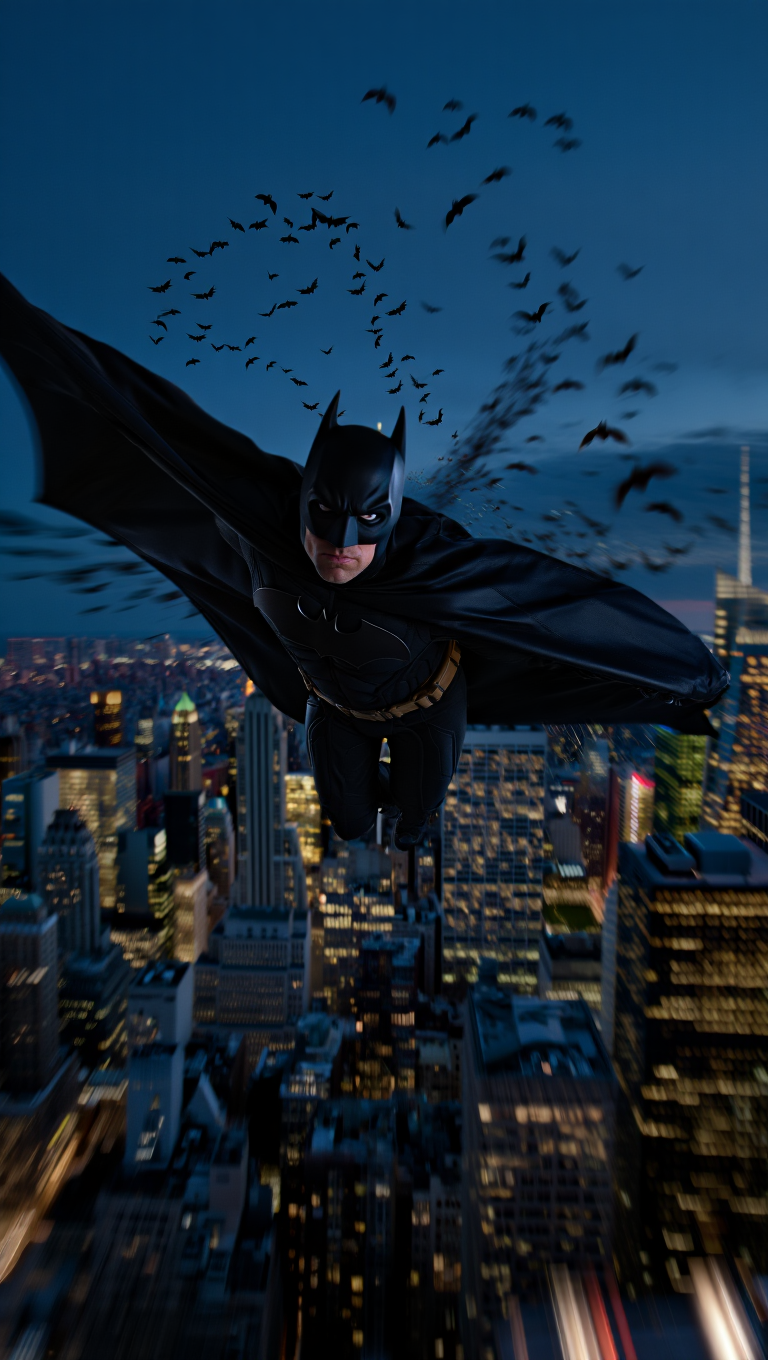 <p>A lone figure in full Batman armor soars above New York City, cape sweeping through the sky as bats streak past neon-lit towers. The night is alive — and justice flies with it.</p>