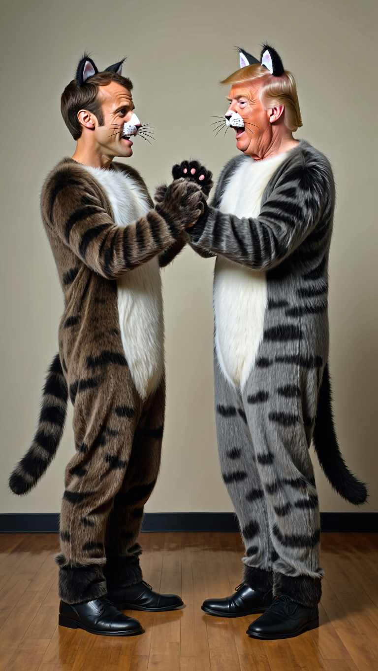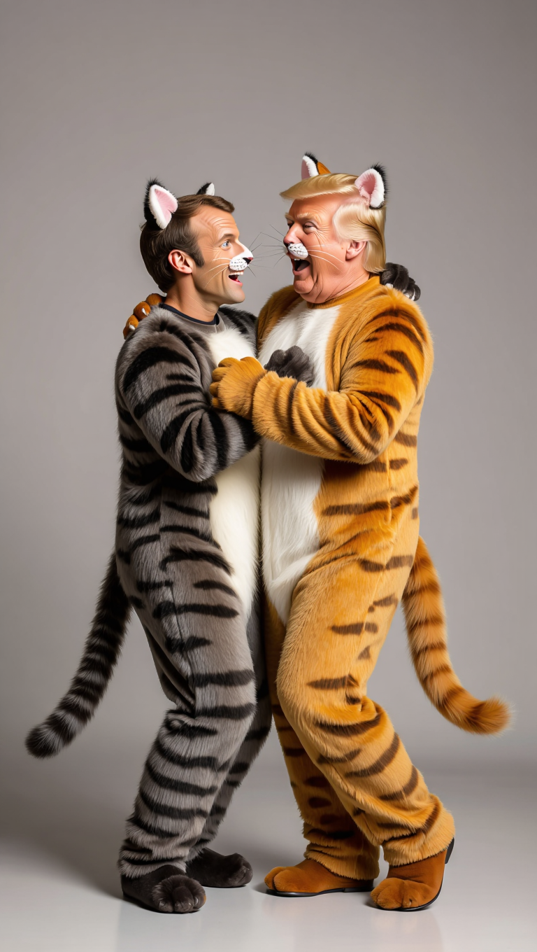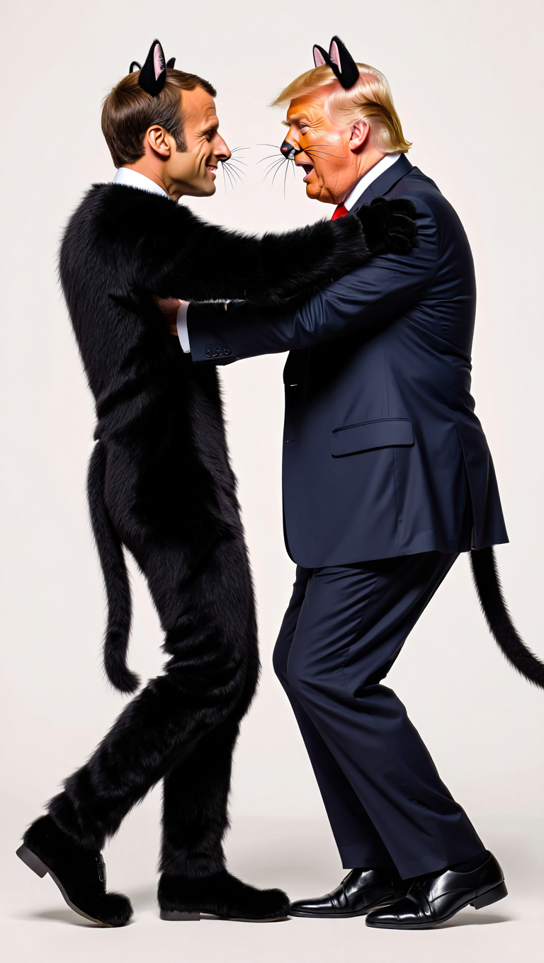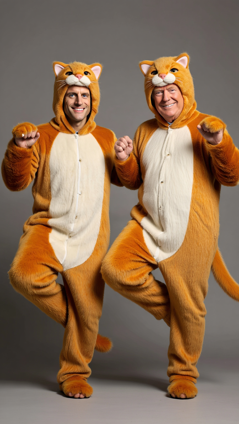 Emmanuel Macron and Donald Trump share a playful moment in full cat costumes, striking mirrored dance poses with raised paws and feline flair in a studio setting.