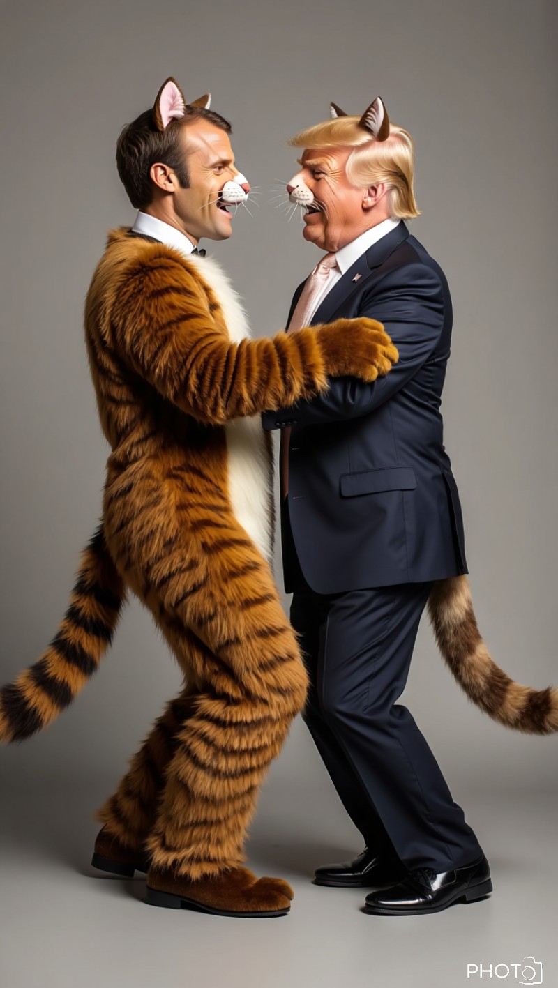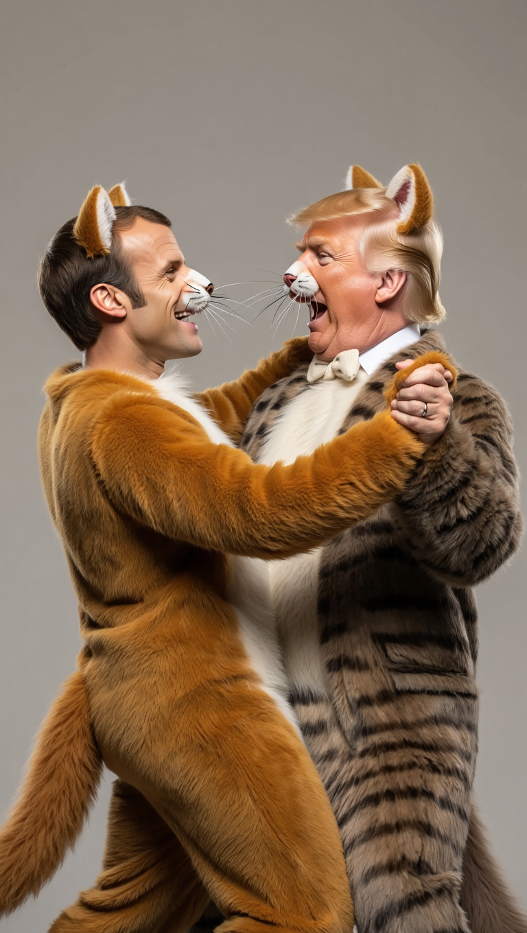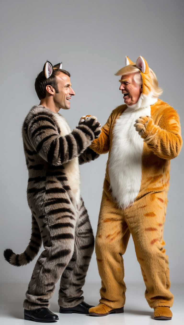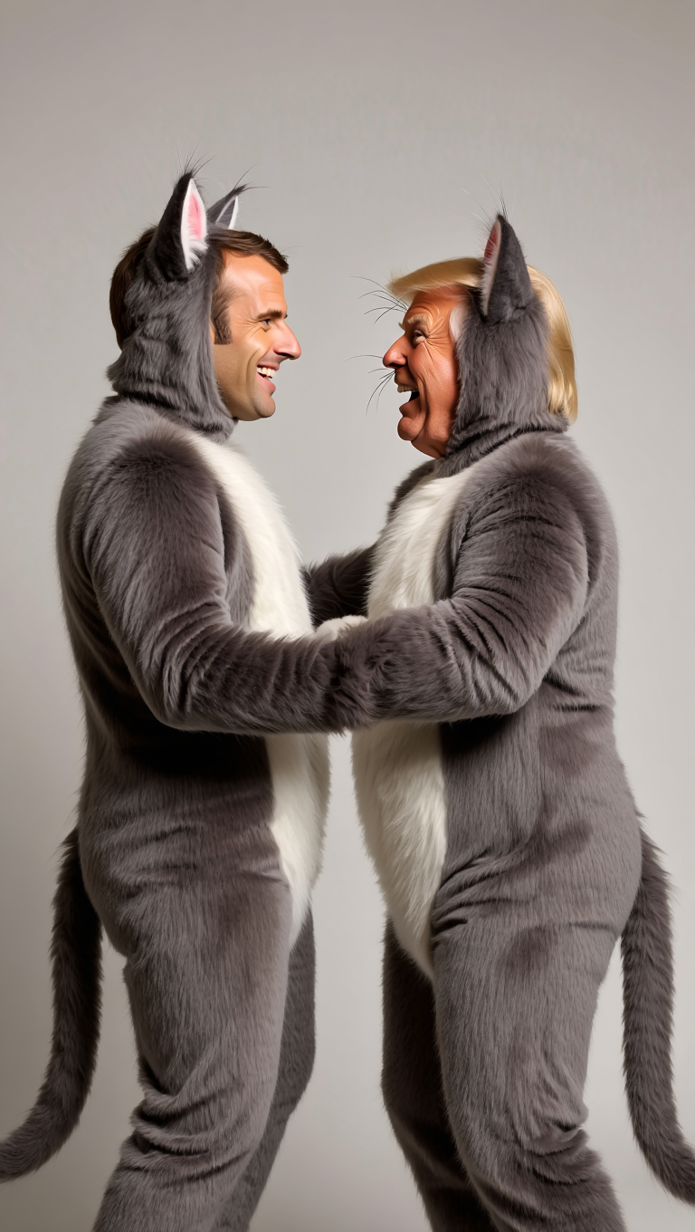 Emmanuel Macron and Donald Trump share a playful moment in full cat costumes, striking mirrored dance poses with raised paws and feline flair in a studio setting.