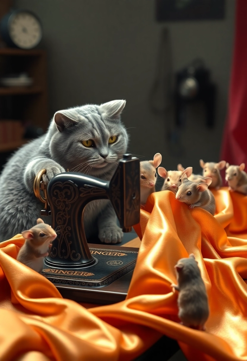 A fat gray cat supervises a group of mice working on an antique Singer sewing machine, stitching shiny flowing fabric. — ultra-realistic, photo-quality, cinematic lighting, high resolution, soft natural shadows, vivid colors, depth of field, 1:1 aspect ratio.