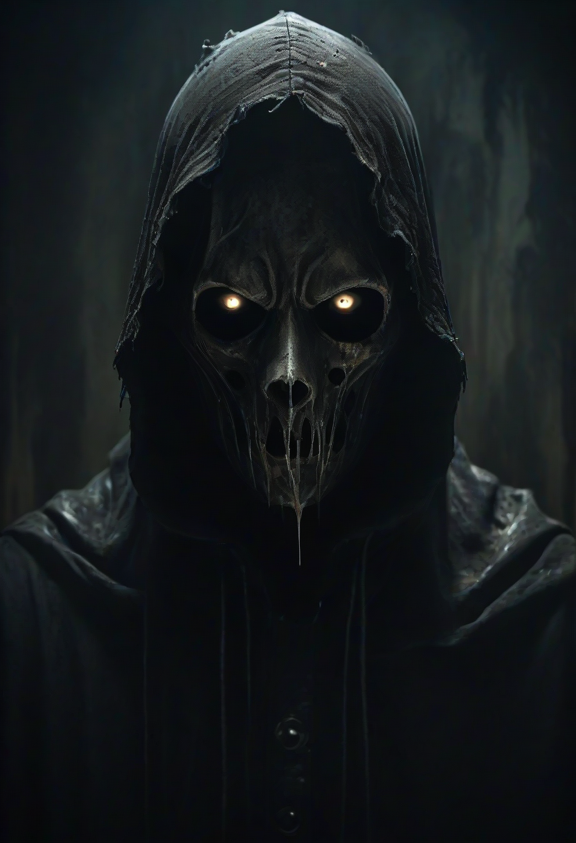 A S1n0z1ck style surreal, m100-style gothic scene in a dimly lit, This scene describes a close-up of a dark, tattered hood, seemingly empty, yet from within its shadowy depths, two ghostly eyes faintly glow with a menacing, almost malevolent light. The hood belongs to a long coat that appears much darker now, with muted, almost blackened hues of deep greens, dark blues, and earthy browns.