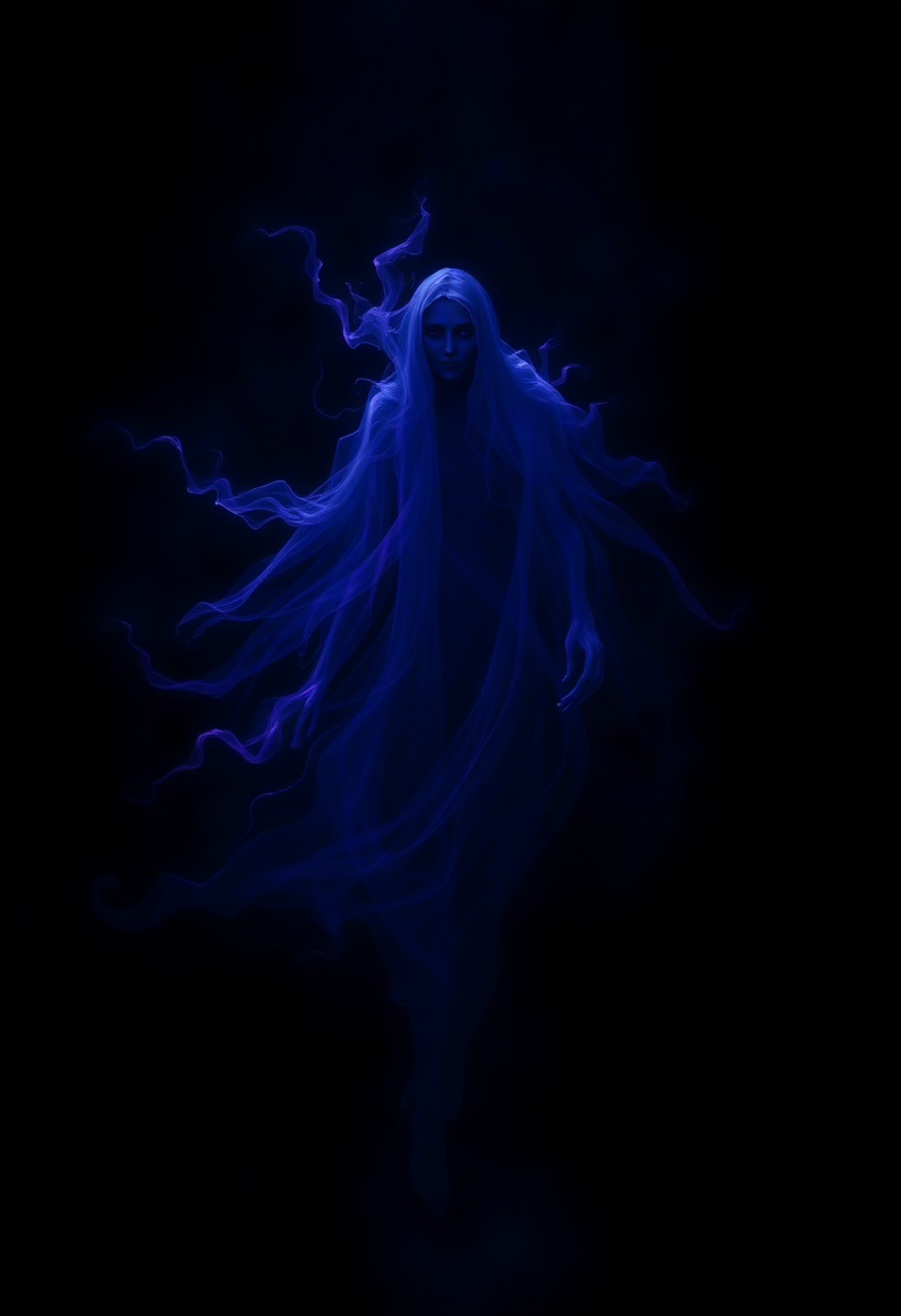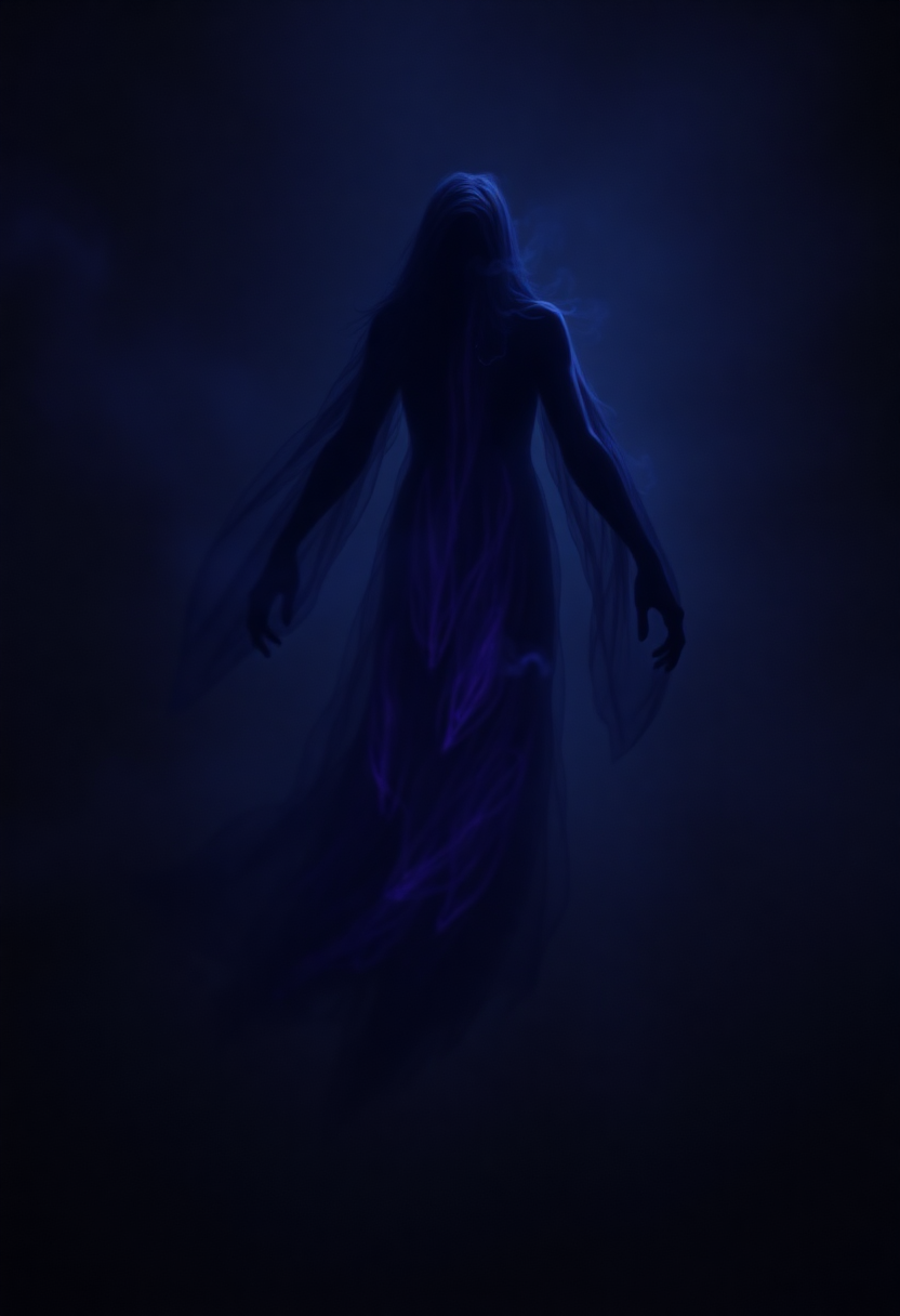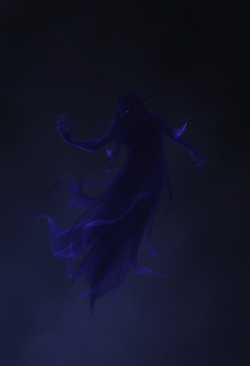 A dark, ethereal lich spirit floats in a haunting void, its form barely visible, flickering with deep violet and midnight blue hues. Its ghostly figure, shadowy and graceful, exudes an eerie, ancient energy. Wisps of darkness swirl around the spirit, shimmering with faint traces of arcane magic.