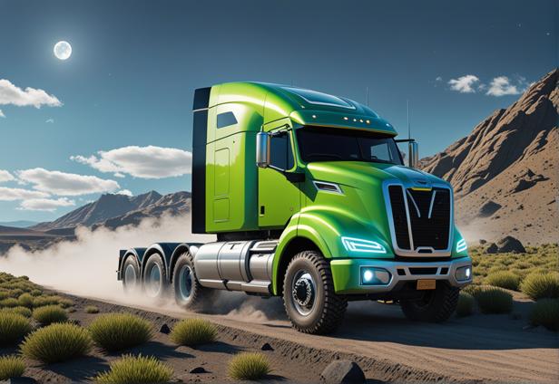 An ethereal portrait of a transparent semi-truck revealing its intricate compressed air system, adorned with neon green bioluminescence. Ascending a hill, it contrasts sharply against a minimalistic, foggy white background. The soft blue futuristic lighting highlights the pneumatic hoses, creating a surreal sci-fi mood.