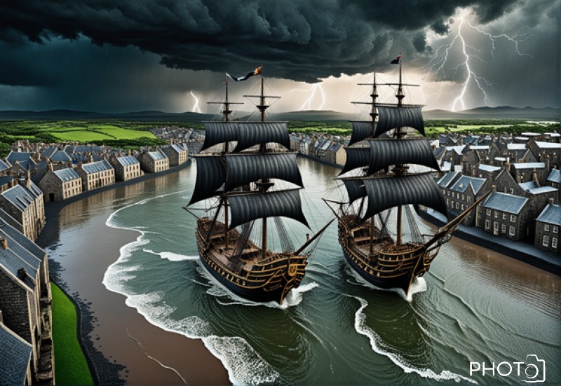 An aerial glimpse of a weathered 16th-century pirate ship lost on a flooded Irish coast, shrouded in dark storm clouds and illuminated by flashes of lightning. Surrounding sail-like structures and Phinisi ships enhance the surreal, chaotic scene, accentuated by rainfall and swirling ripples.