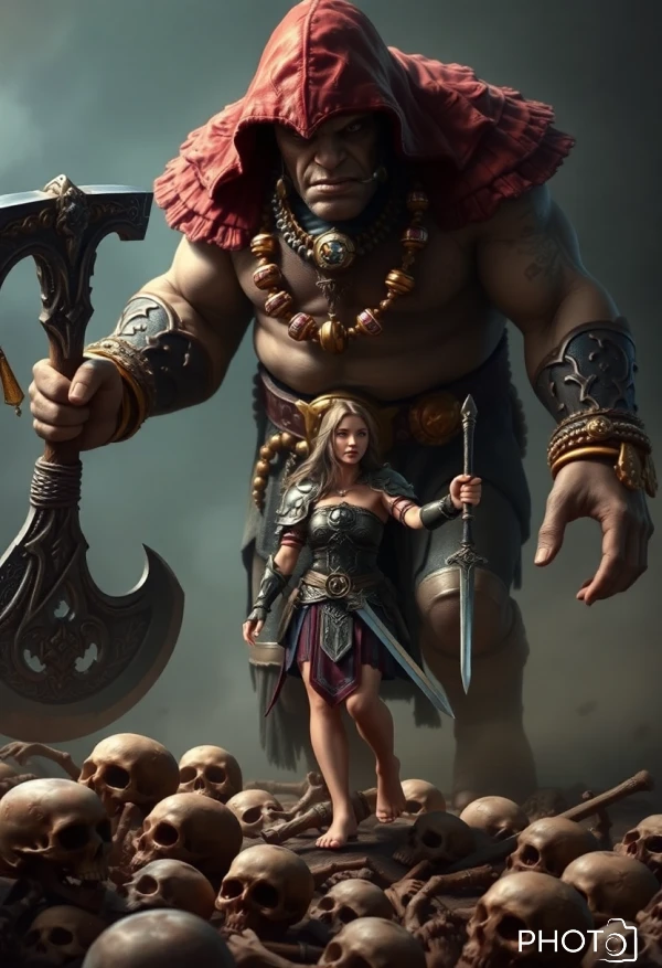 Ultra realistic looking DND character, ), hooded giant ogre, holding a giant cursed axe and walking menacing, walking over crushed skeletons, golden ornamented bracelets, jeweled belt, and necklaces. Facing him, stands a tiny barefoot female warrior with full armor, arms extended to the sides, holding a sword and a dagger, standing confidently, dramatic scene, cinematic