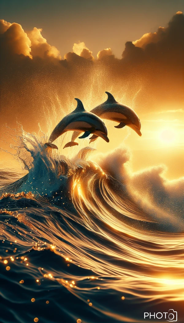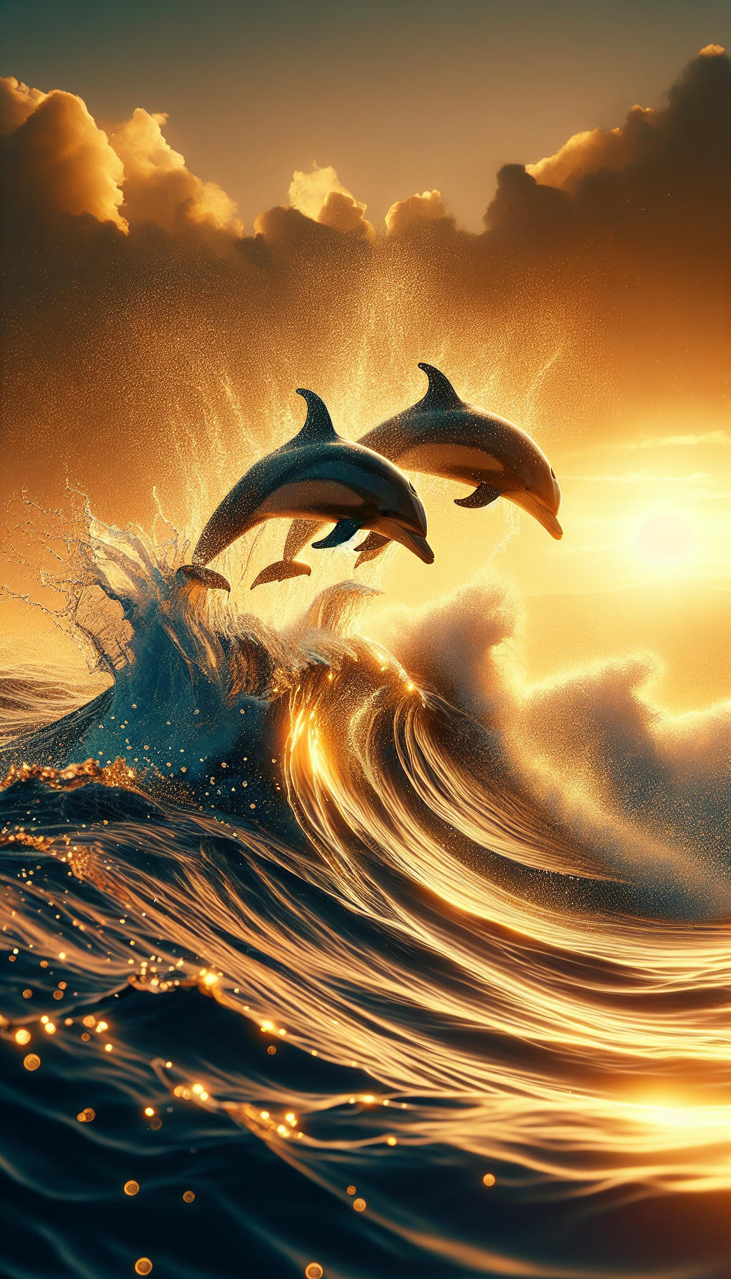 A vibrant 8K image of dolphins mid-leap, water droplets shimmering in the golden sunrise. The waves crash dynamically, capturing the fluid motion and energy of the scene.