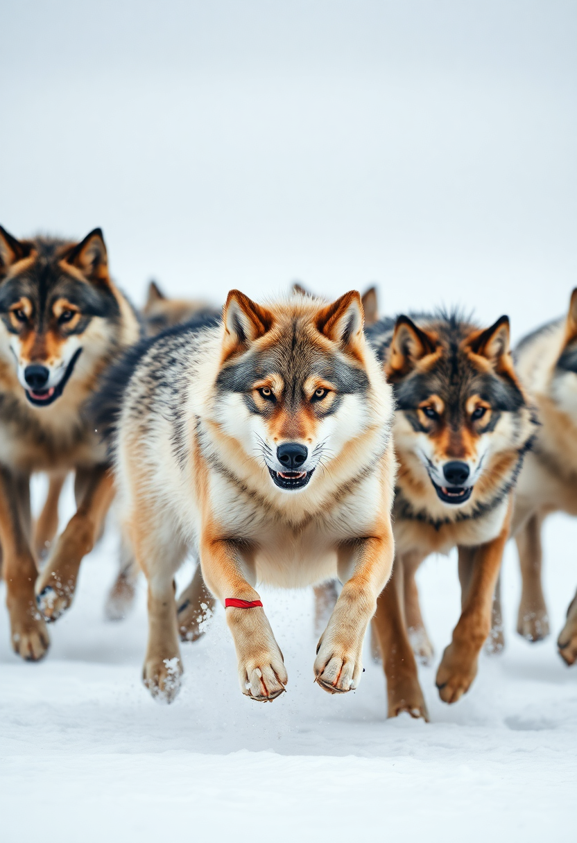 An intense 8K capture of a pack of wolves running together, their fur ruffled by the wind and snowflakes. The motion of their paws kicking up snow adds depth and energy to the scene.