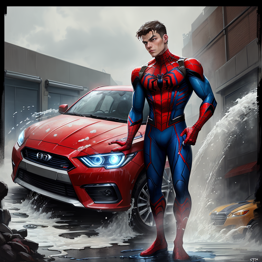 Discover what Spider-Man does on his day off! Caught in action at a local car wash, Spidey scrubs down vehicles with his signature style, decked out in his suit and a matching blue and red uniform. A fun and unique peek into the superhero life beyond saving the world!