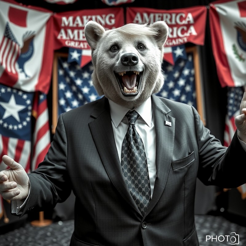 Unleash the whimsy with this surreal image of a half-human, half-bear character resembling a high-profile political figure, decked out in a formal presidential suit and tie. Dancing joyfully against a backdrop of patriotic flags and slogans, this unique blend of political satire and animal humor captures a festive and humorous spirit of patriotism.
