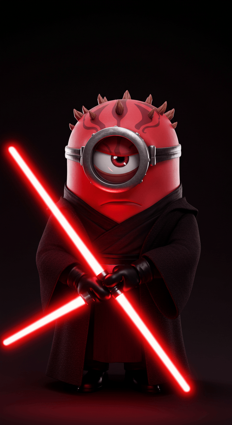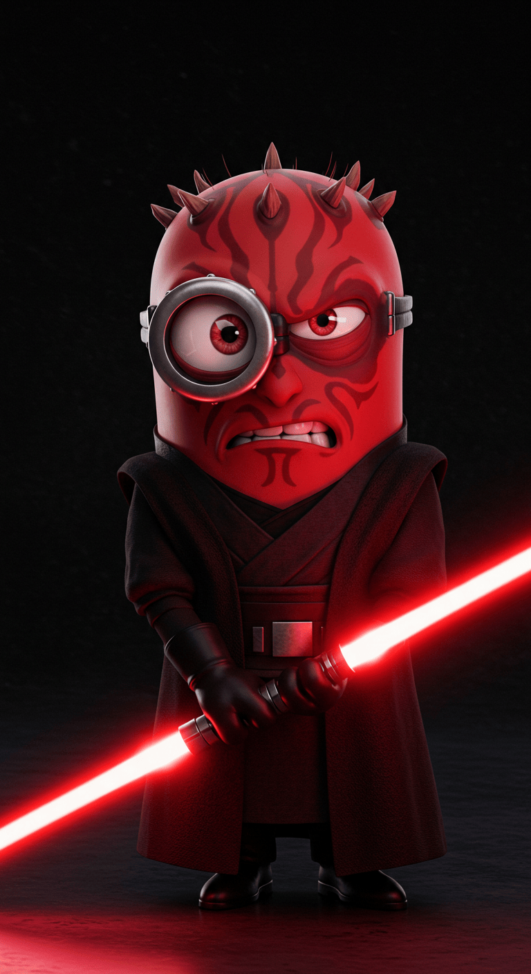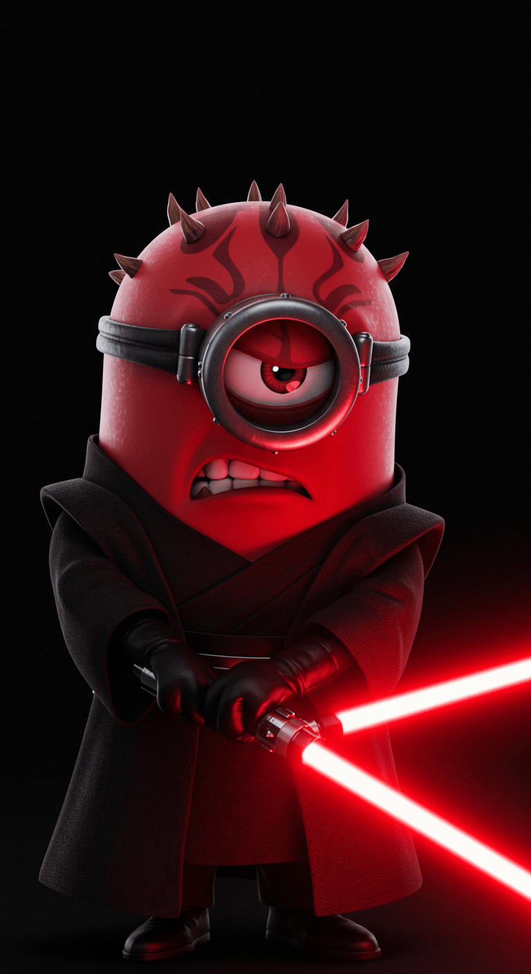 A fierce, red-skinned Minion transformed into a Dark Jedi, sporting Darth Maul-like spikes and a scowling, one-eyed glare. Draped in a shadowy Sith robe, he grips a flawless red lightsaber, its glow cutting through a pitch-black void as he points it menacingly at you. A stunning 4K masterpiece of concept art!