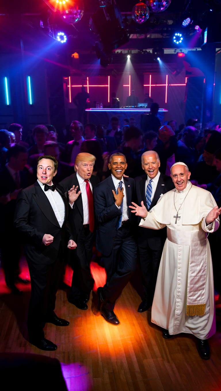 Epic nightlife moment! Elon Musk, Donald Trump, Barack Obama, Joe Biden, and Pope Francis tearing up the dance floor together ???????? Wild expressions, laser beams, disco ball vibes — pure party chaos under dynamic lights! ????????