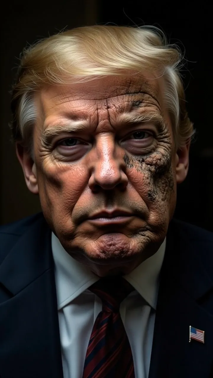 Photorealistic portrait of Donald Trump, half human, half-man, subtly merging features. One side distinctly human, the other side exhibiting exaggerated, almost monstrous masculine traits. Trump's expression is focused, sniffing intently, conveying suspicion and power. Chiaroscuro lighting. Detailed textures. 8k resolution.