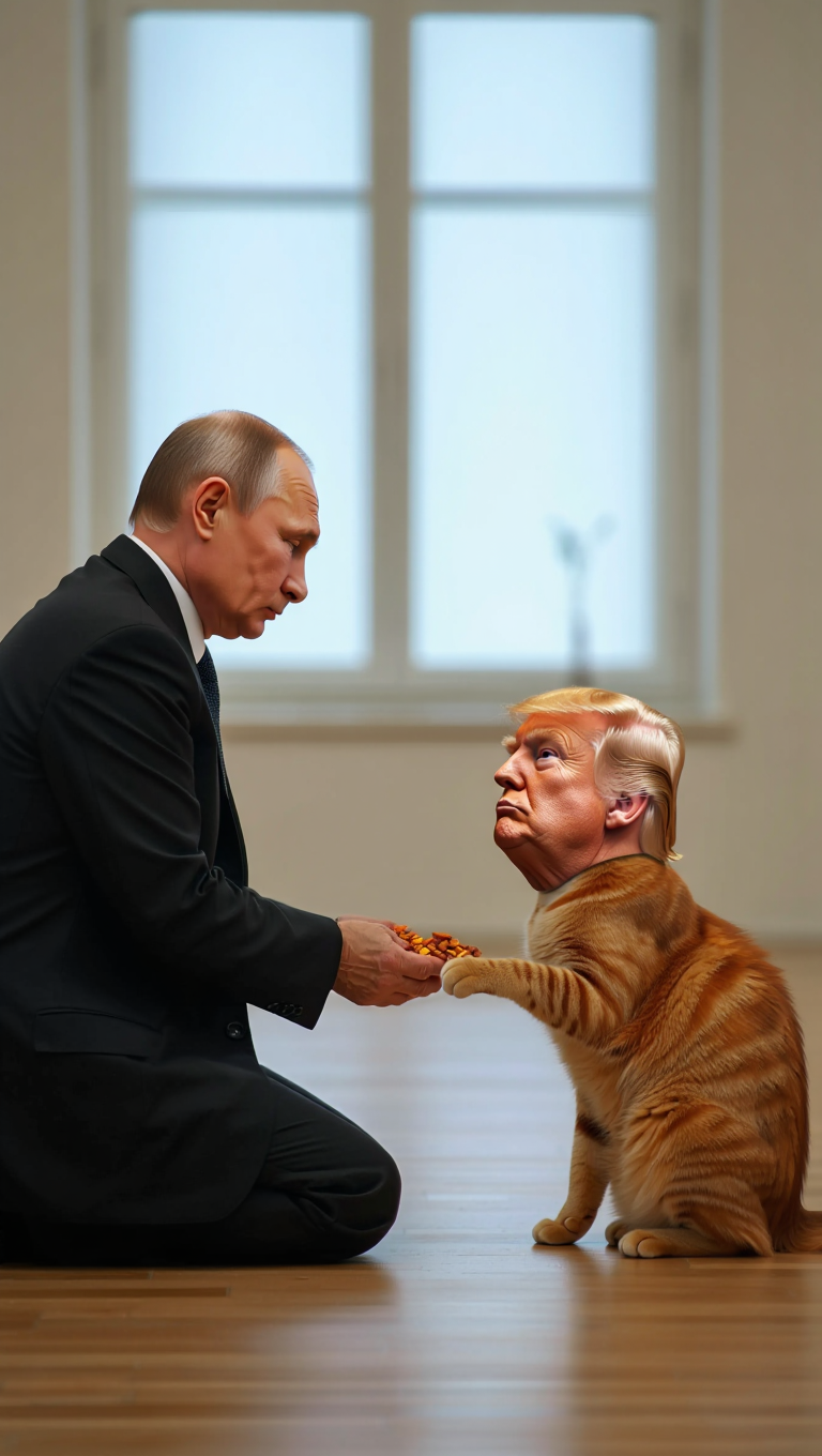 A surreal photorealistic moment where Putin, in formal black attire, offers treats to a ginger cat with Donald Trump’s human head, set in a bright minimalist room with natural daylight.
