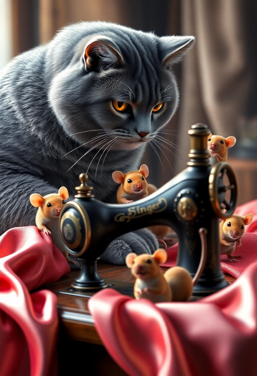 A fat gray cat supervises a group of mice working on an antique Singer sewing machine, stitching shiny flowing fabric. — ultra-realistic, photo-quality, cinematic lighting, high resolution, soft natural shadows, vivid colors, depth of field, 1:1 aspect ratio.
