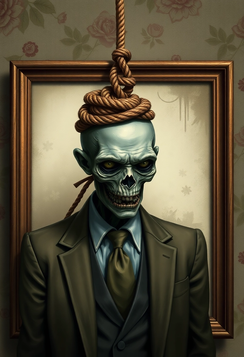 A zombie in a frame wearing a suit, but his head is a slightly thick rope made of several knots, with a vaguely visible face, realistic, with a floral background.