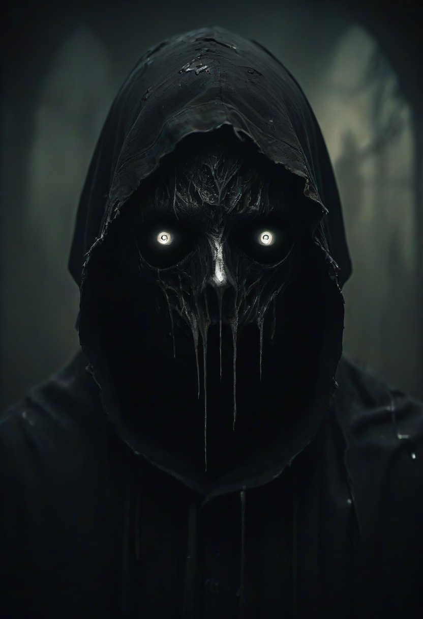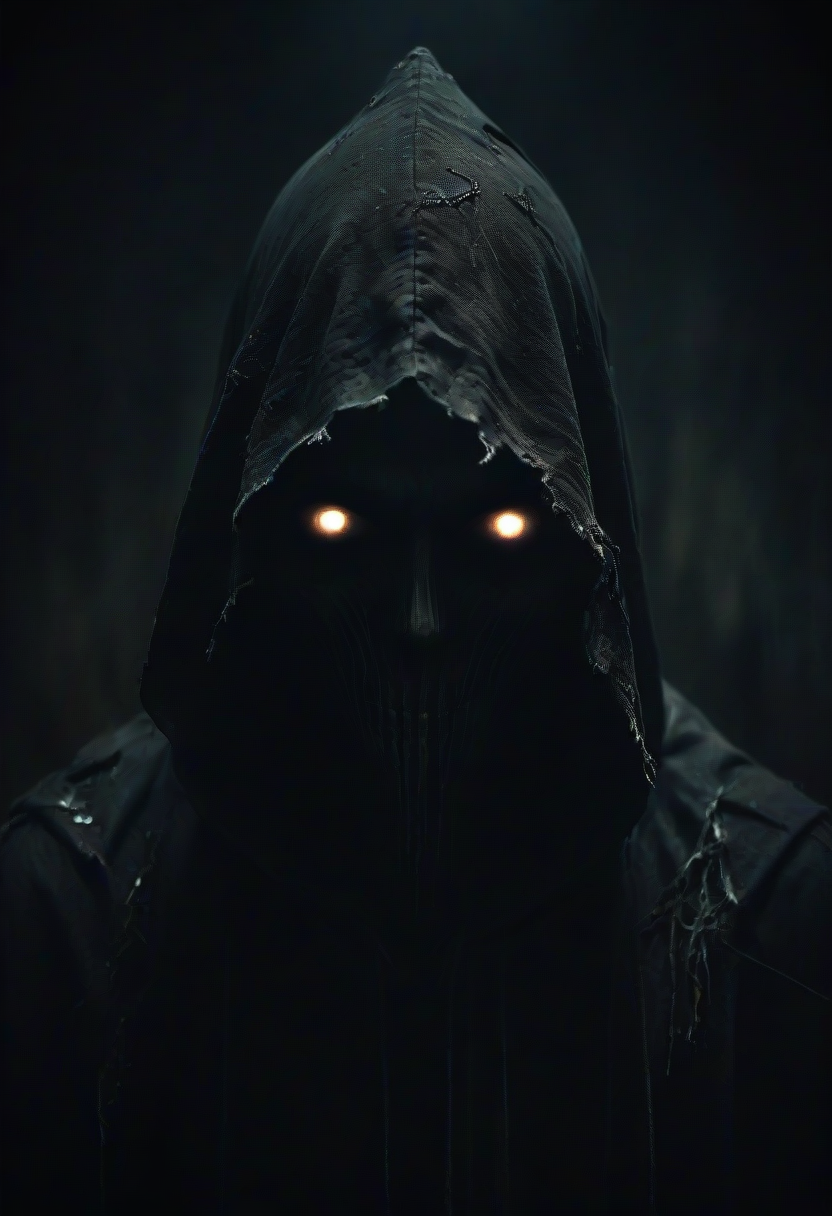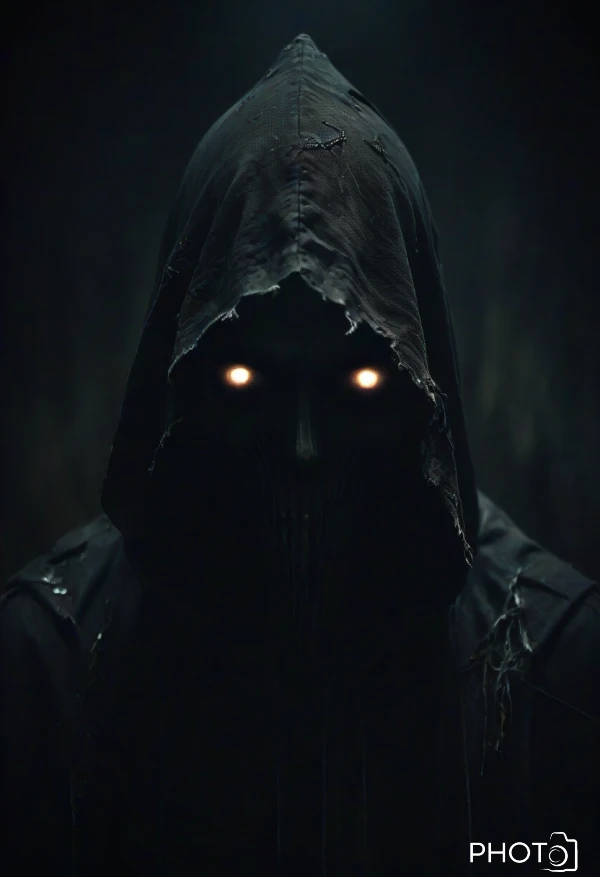 A S1n0z1ck style surreal, m100-style gothic scene in a dimly lit, This scene describes a close-up of a dark, tattered hood, seemingly empty, yet from within its shadowy depths, two ghostly eyes faintly glow with a menacing, almost malevolent light. The hood belongs to a long coat that appears much darker now, with muted, almost blackened hues of deep greens, dark blues, and earthy browns.