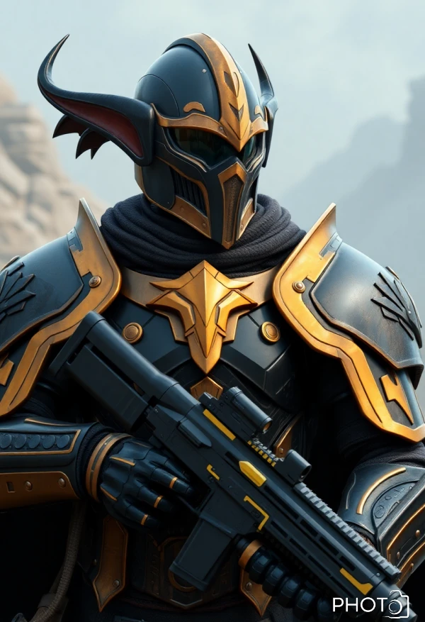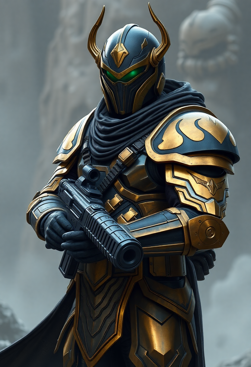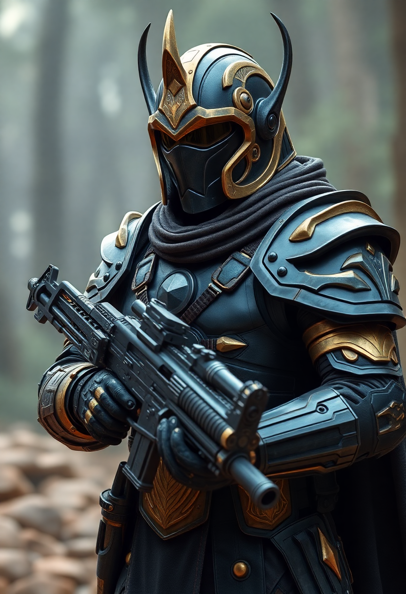 high elf sci fi soldier wearing heavy sci fi elven armor, black and gold armor and helmet, visor, male, holding a light machine gun, full body, HD