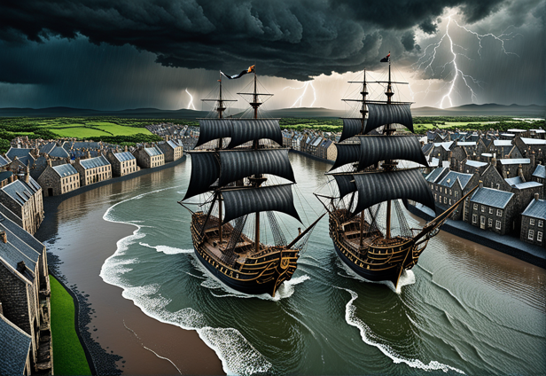 An aerial glimpse of a weathered 16th-century pirate ship lost on a flooded Irish coast, shrouded in dark storm clouds and illuminated by flashes of lightning. Surrounding sail-like structures and Phinisi ships enhance the surreal, chaotic scene, accentuated by rainfall and swirling ripples.