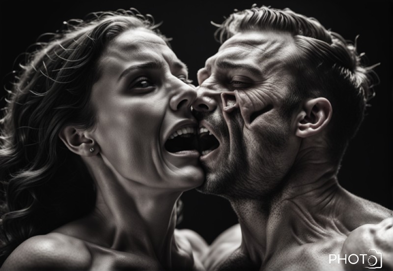 An intricate, hyper-realistic portrayal of a woman being engulfed by a man, captured in stunning 8K detail. This symmetrical artwork showcases a dramatic play of light and shadow, creating a cinematic atmosphere that captivates the viewer.